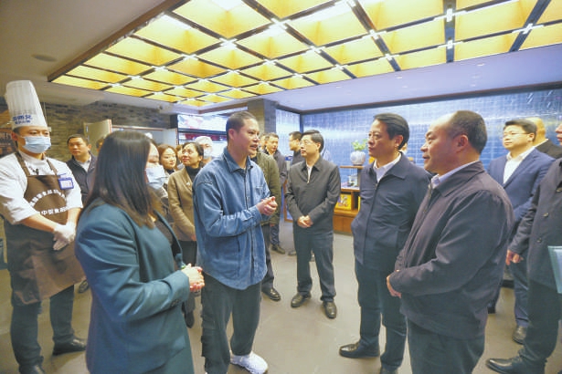 图一:重庆市市场监管局局长唐英瑜(前排右一)到餐饮企业调研“山城有信”信用码推广情况。
