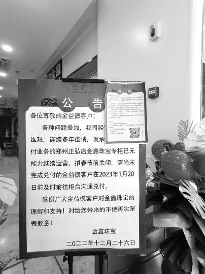 记者看到店内一片狼藉,珠宝专柜已经空空如也。门口的公告牌上写着:“各种问题叠加,我司经营早已举步维艰。连续多年疫情,现承接金益德兑付业务的郑州正弘店金鑫珠宝专柜已无能力继续运营,拟春节前关闭,请尚未完成兑付的金益德客户在2023年1月20日前及时前往柜台沟通对付。”落款时间为“2022年12月26日”。