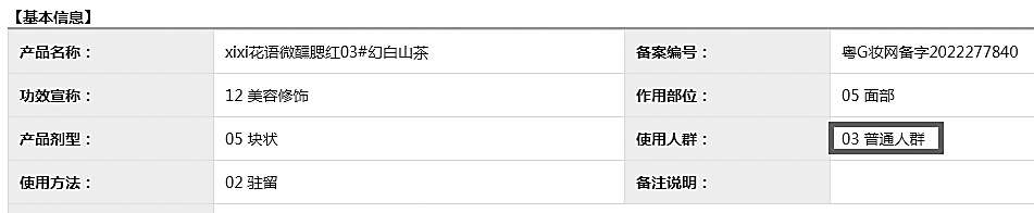 又如,慕缘美妆店经销的产品信息关键词组合为“xixi花语微醺双色儿童专用腮红粉质细腻显气色显白不挑皮舞台演出胭脂3#幻白山茶”,备案名称“xixi花语微醺腮红03#幻白山茶”系普通人群化妆品,没有“小金盾”标识,但产品信息关键词组合中使用了“儿童专用”字样。