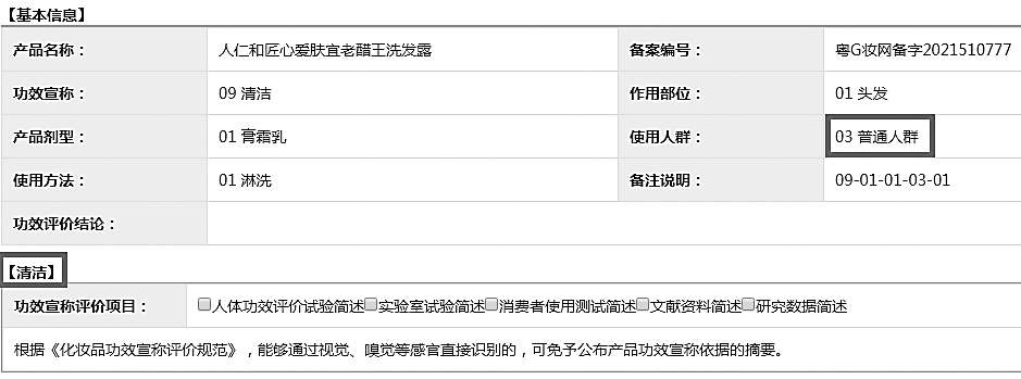例如,药都仁和旗舰店经销的产品信息关键词组合为“仁和剪发虫儿童去屑止痒洗发水专用女童男中大孩露青少年去旗舰店”,备案名称“人仁和匠心爱肤宜老醋王洗发露”系普通人群化妆品,没有“小金盾”标识,标签标注使用人群为普通人群,但在网页上多处宣称适用于儿童。此外,该产品备案的功效只有保湿,但在网页上多处有去屑、修护、滋养等功效宣称的字样;网页中提及的“所选测试人员均无过敏现象”字样旁的报告并不是致敏性测试报告。