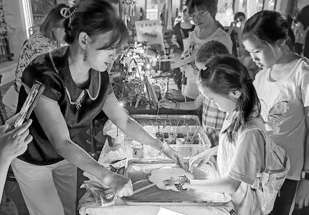 图二:小朋友在商家帮助下制作漆扇。