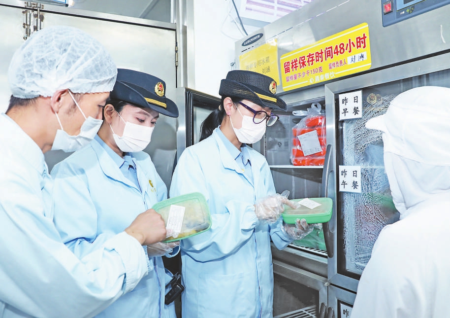 近日,北京市东城区市场监管局开展辖区中小学、幼儿园等机构食品安全监督检查。执法人员重点查看了学校食堂索证索票、进货查验、从业人员健康管理、食品留样等制度落实情况。图为执法人员检查东四九条小学学生餐留样情况。