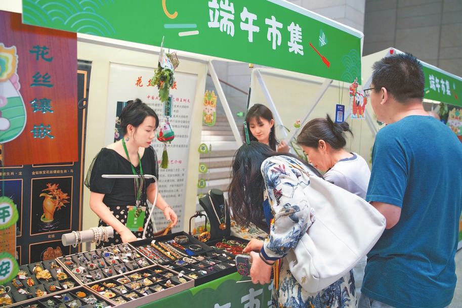 5月30日至6月2日期间,“端午非遗市集”在北京中国非物质文化遗产馆举办,来自河北、山西、浙江、福建、山东、湖南、广东等12个省市的30个非遗项目参与其中。此次市集内容丰富多样,有五彩绳编、苏绣香囊、壮族织锦等传统手工艺品,还有桃花江柿饼粽、桃酥等各式特色糕点,让市民沉浸式领略端午文化的无限魅力。李伟摄影报道