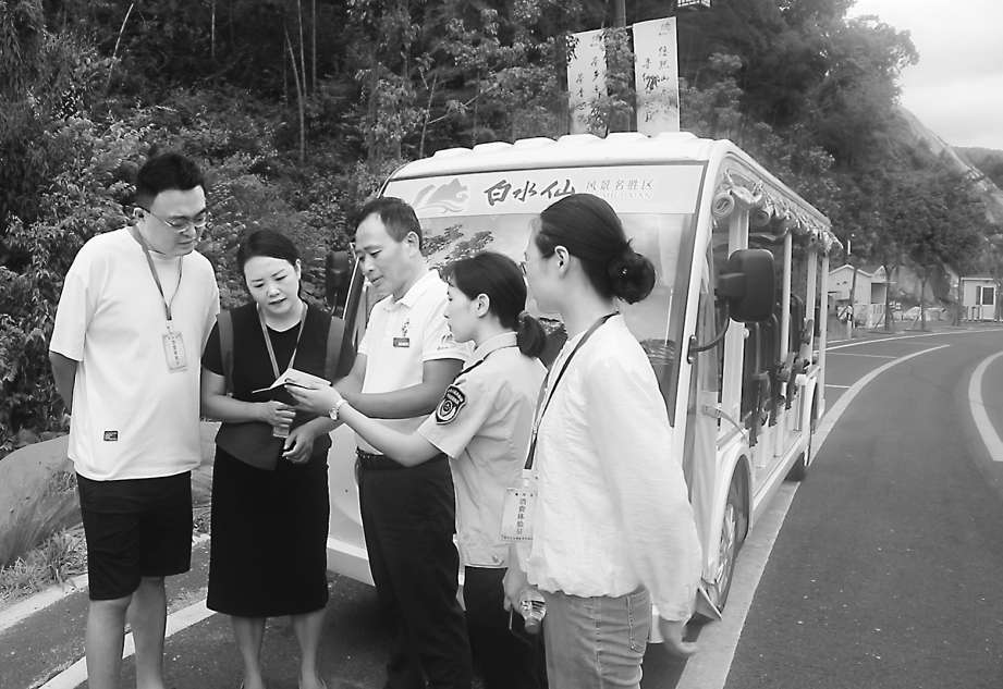 8月5日,江西省遂川县消费者协会联合县市场监管局、县融媒体中心等,组织放心消费体验员走进该县白水仙景区开展消费体察活动,助力打造安全、诚信、满意的旅游消费环境。图为体验员们查看观光车安全资质。