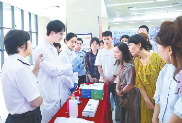 活动中,南宁海关技术中心工作人员借助视频向市民代表直观展示随机抽取、规范封装、全程记录的标准化操作,帮助市民了解水果抽检工作;在重金属检测区域,工作人员详细讲解了食品安全知识;在农药残留检测实验室,工作人员介绍了水果农残的检测流程、常见农药残留种类,展示了全自动氮吹仪、旋转蒸发仪等仪器以及相关专用试剂。
