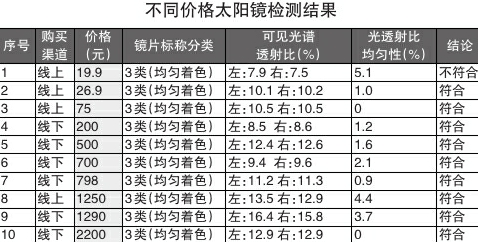 实验人员选取了价格19.9元到2200元的10批次3类太阳镜样品进行可见光谱、光透射比均匀性检测。从试验结果来看,太阳镜的价格与其基础遮光性能(可见光谱透射比、光透射比均匀性)不存在必然的正比关系。除线上购买的一款19.9元样品以外,其余样品无论价格高低均符合国家标准对遮光性能的要求。