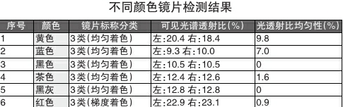 从试验结果来看,黑、灰色系镜片能均匀减少光线强度,不改变物体原本的颜色和对比度,适合日常佩戴、驾驶、户外活动等多种场景;黄、红色镜片可见光阻隔能力较弱,强光下可能会让眼睛感觉不适,不推荐日常遮阳使用。