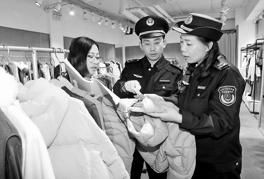 11月5日,北京市西城区市场监管局开展羽绒服、棉服等服装产品质量监督检查,依法查处假冒伪劣产品,坚决杜绝填充物以次充好、绒子含量不足、充绒量不足等问题。本报记者董芳忠摄影报道