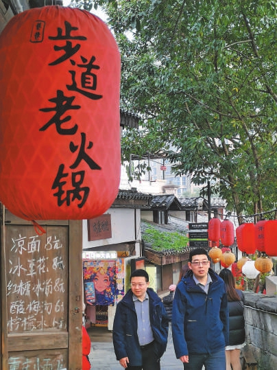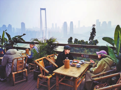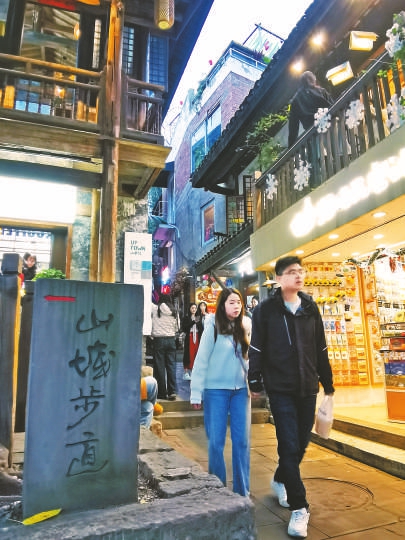 离戴家巷仅2公里的山城巷,也是一条集历史风貌、山城特色和旖旎江景于一体的代表性步道,全长1748米,其中临崖栈道300米,是重庆古城墙步道的一条重要支线。改造时秉持“修旧如旧”理念,保留了80%的原有建筑,同时新建生态游园,引入文创、咖啡等新业态,打造沉浸式消费场景,有近百家商户入驻。来自青海的游客马女士和朋友花55元,在“梯坎茶舍”点了一盏热茶,看着晚霞将长江水面染得通红,感叹道:“这种感觉非常奇妙和美好。”在“步道老火锅”店,来自山东的游客刘先生一家三口,花190元感受了地道的麻辣火锅,还品尝了冰豆花、红糖冰粉、糯米团、麻花等风味小吃。