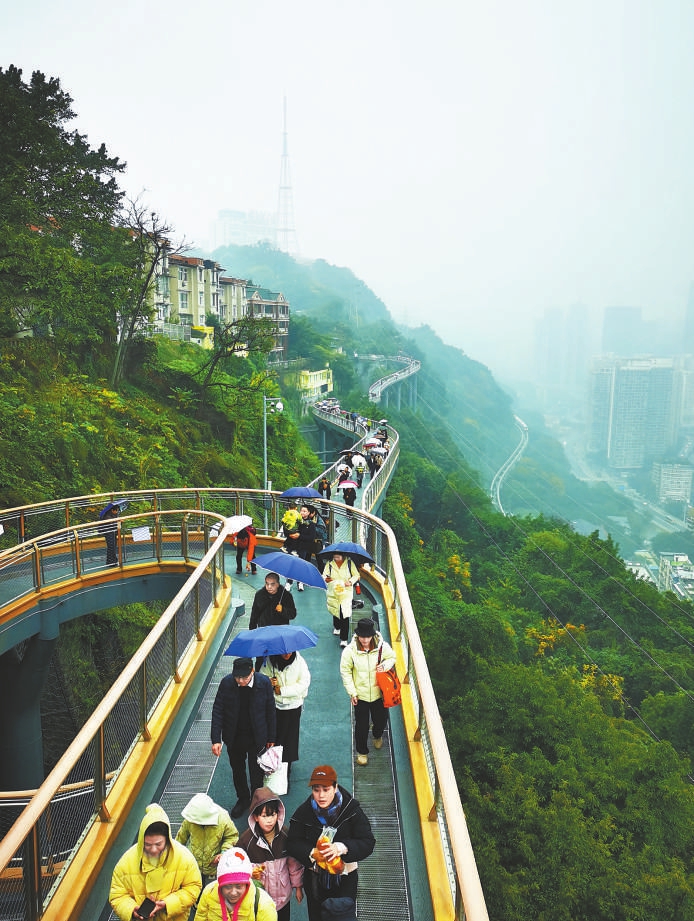 鹅岭栈桥全长460米,2025年11月12日正式开放后,迅速成为重庆山城步道网络又一标志性打卡点。2018年以来,重庆市着力推进集街巷步道、滨江步道、山林步道于一体的山城步道网络建设,截至目前,已累计建成山城步道871公里。这些蜿蜒于山水之间的城市毛细血管,将街区与风景融为一体,成为焕新业态、创造场景、拉动消费的“步道飘带”。