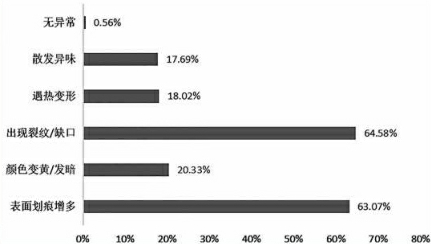 在使用密胺餐具过程中,64.58%的人遇到餐具使用一段时间后出现裂纹、缺口,63.07%发现餐具表面划痕越来越多,这两种现象是“重灾区”。还有两成人反映餐具变黄发暗、遇热变形,甚至散发异味。只有0.56%的人使用过程中餐具完好。