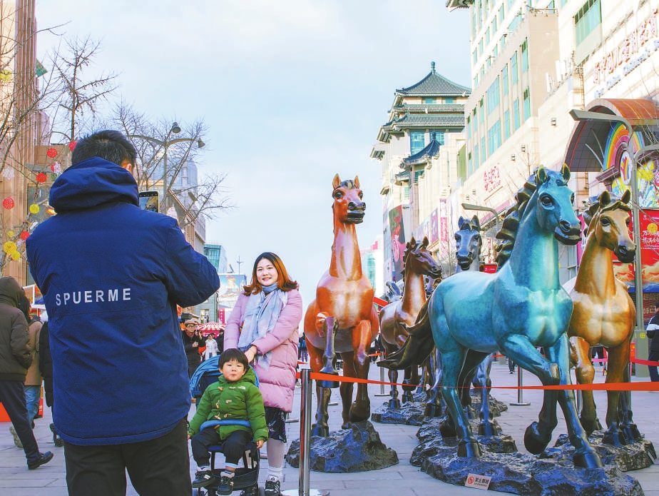 近日,在北京市人民政府新闻办公室召开的2026年北京市春节文化活动新闻发布会上,多部门发布了5000余项丰富多彩的春节文化活动。活动以“骏马贺新春 京彩中国年”为总主题,下设“庙会灯会过大年”“京彩演艺过大年”“文化消费过大年”等7个系列活动。在“文化消费过大年”板块中,北京各大商圈共开展文商旅体展促消费活动460余项。其中,王府井商圈举办2026年“金街过大年”暨“王府井发布”全国大型品牌活动。图为北京王府井大街上,中国工艺美术大师朱炳仁的作品《王府八骏》吸引游人驻足拍照。 李伟摄影报道
