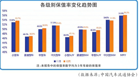 《报告》显示,与此前几个月各级别保值率大幅波动不同的是,去年12月,保有量较大的小型车、中型车、中型SUV等细分市场保值率有显著回升,分别为53.7%、50.4%和49.6%。紧凑型车、MPV和小型SUV保值率也有不同程度提升。