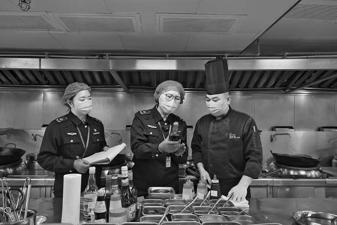 连日来,广西壮族自治区南宁市市场监管部门聚焦餐饮安全关键环节,组织执法力量对承接年夜饭的大中型餐饮单位开展专项检查,督促经营单位严格落实食品安全主体责任,筑牢食品安全防线。图为2月2日,南宁市青秀区市场监管局执法人员在一家提供年夜饭套餐服务的酒店后厨进行检查。何正君 本报记者顾艳伟摄影报道
