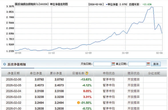 图:2月2日国投白银LOF净值创纪录大跌31.5%。 网络截图