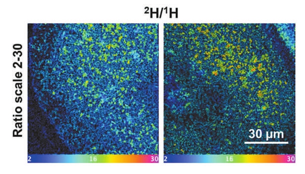 图:运用纳米离子探针观测维他命原B5(蓝绿色荧光标记处)在发丝横截面内部的渗透和结合效果,将其对发芯的修护作用“可视化”。 资料图片