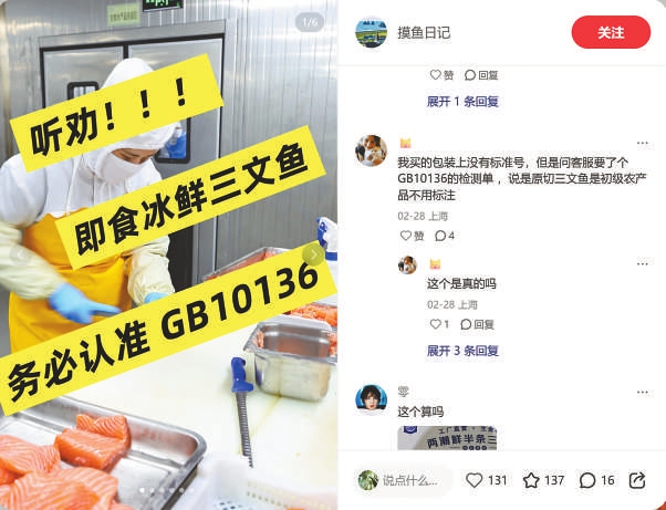 除了分享“知识帖”,跟帖“求指点”的也不在少数。《中国消费者报》记者注意到,在网友“@摸鱼日记”分享的一则题为“听劝!即食冰鲜三文鱼务必认准GB10136”的笔记下,有网友贴出标签图,请教自己所购标注“初级食用农产品”的冰鲜三文鱼能否生吃。网友“@(猫头)”说:“购买的某品牌三文鱼包装上没标准号,问客服要了个GB10136检测单,说原切三文鱼是初级农产品不用标注。”