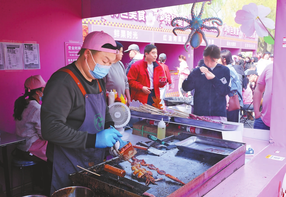近日,北京玉渊潭公园举办春日美食节活动,以美食为载体,为游客打造集美食、购物、游玩、互动于一体的春日盛会。北京簋街的小龙虾、王致和的炸臭豆腐、内蒙古的大烤串、吉林的烤冷面和铁板鱿鱼等各地名吃汇聚一堂,让游客大饱口福。图为铁板鱿鱼鲜香诱人。 本报记者董芳忠摄影报道