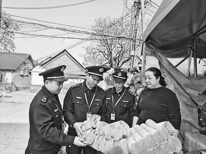 图一:执法人员检查摊贩所售商品。