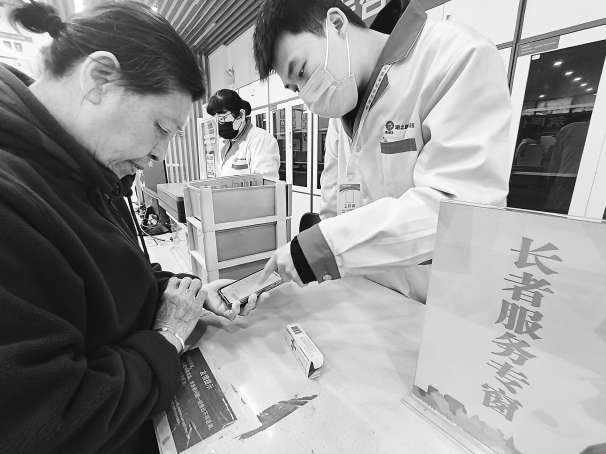在收银台前,设置了柔软的爱心休息椅,供老年人中途歇脚。每个收银台旁都贴心地摆放着老花镜、放大镜,方便随时取用。店内保留现金支付通道,配备适合老年人操作的智能手机,执业药师手把手教学,帮助老年消费者跨越“数字鸿沟”。